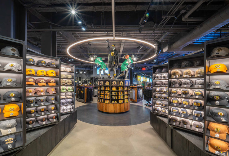 This new space was created to enable the Boston professional hockey and basketball sports teams, the Bruins and the Celtics to co-exist in a store without losing either identity.